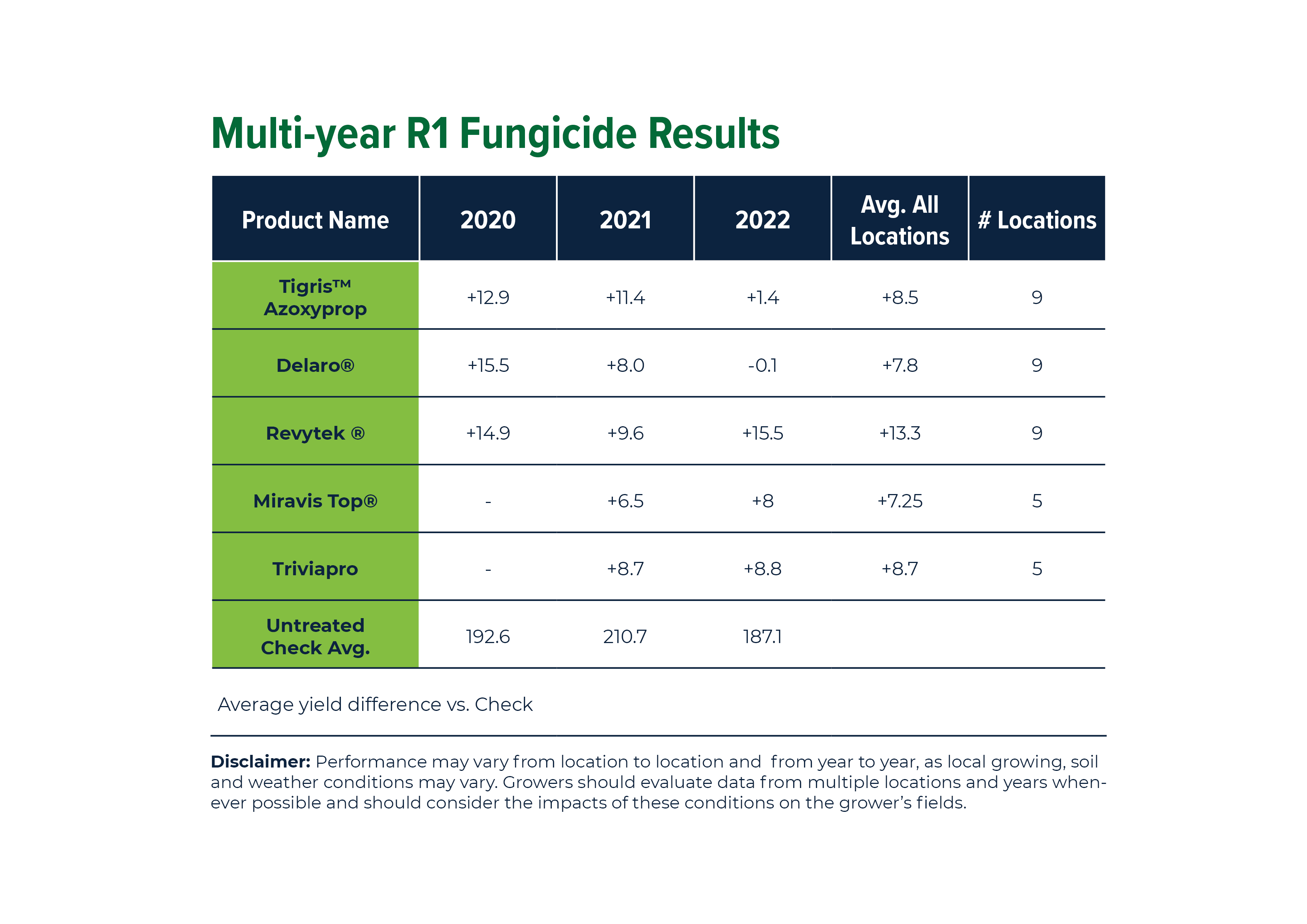 Disclaimer: Performance may vary from location to location and from year to year, as local growing, soil and weather conditions may vary. Growers should evaluate data from multiple locations and years whenever possible and should consider the impacts of these conditions on the grower’s fields.