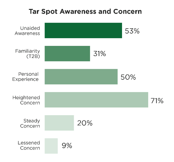 Despite a relatively dry growing season in 2022 that limited tar spot’s impact, 71% of the farmers surveyed expressed heightened concern about the disease, primarily due to its rapid spread.